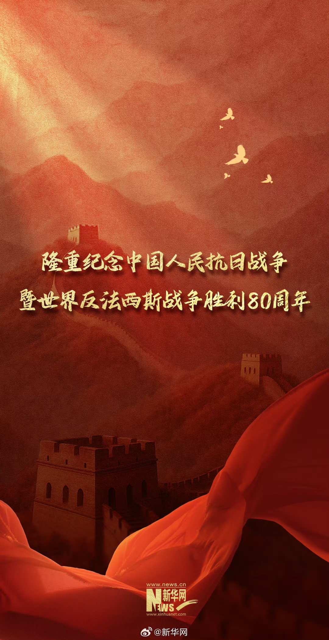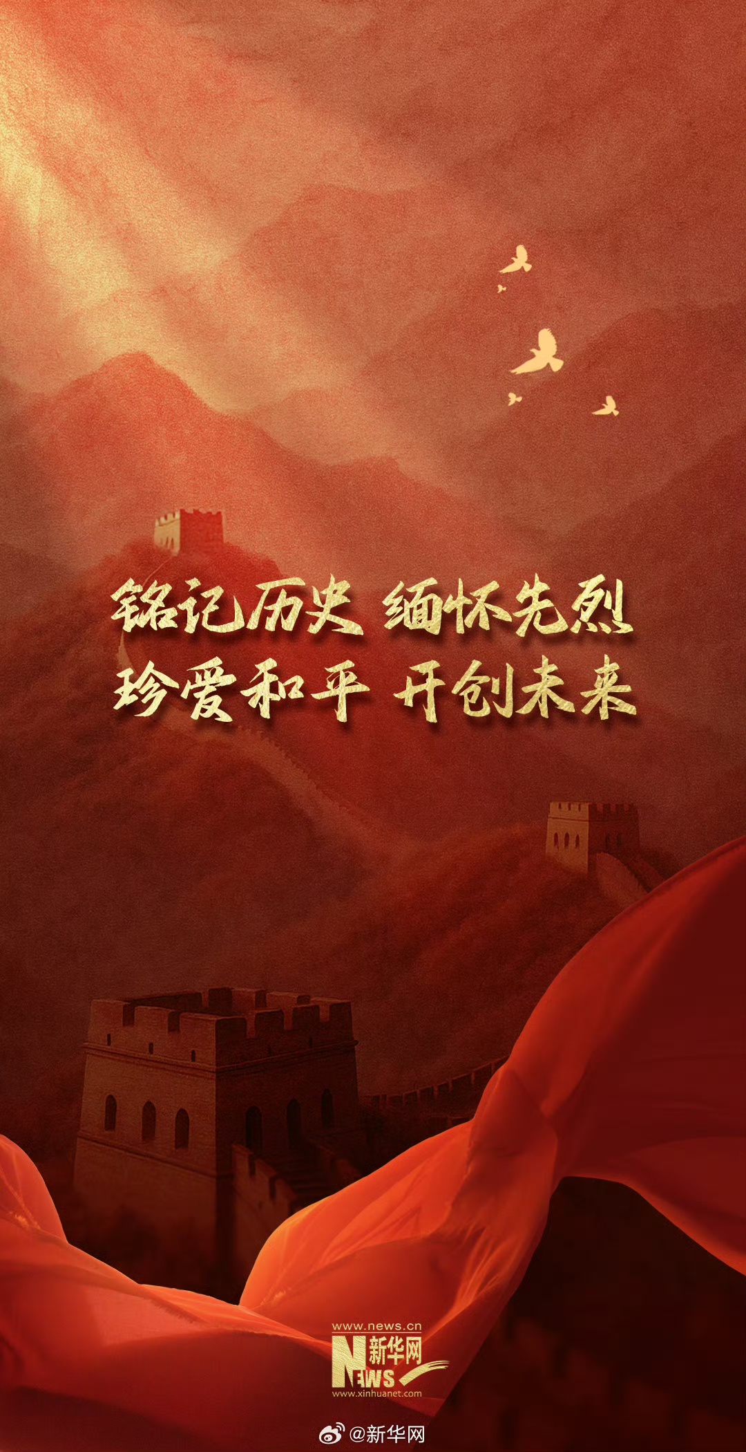 今天,我们隆重集会,纪念中国人民抗日战争暨世界反法西斯战争胜利80周年,共同铭记历史、缅怀先烈、珍爱和平、开创未来。